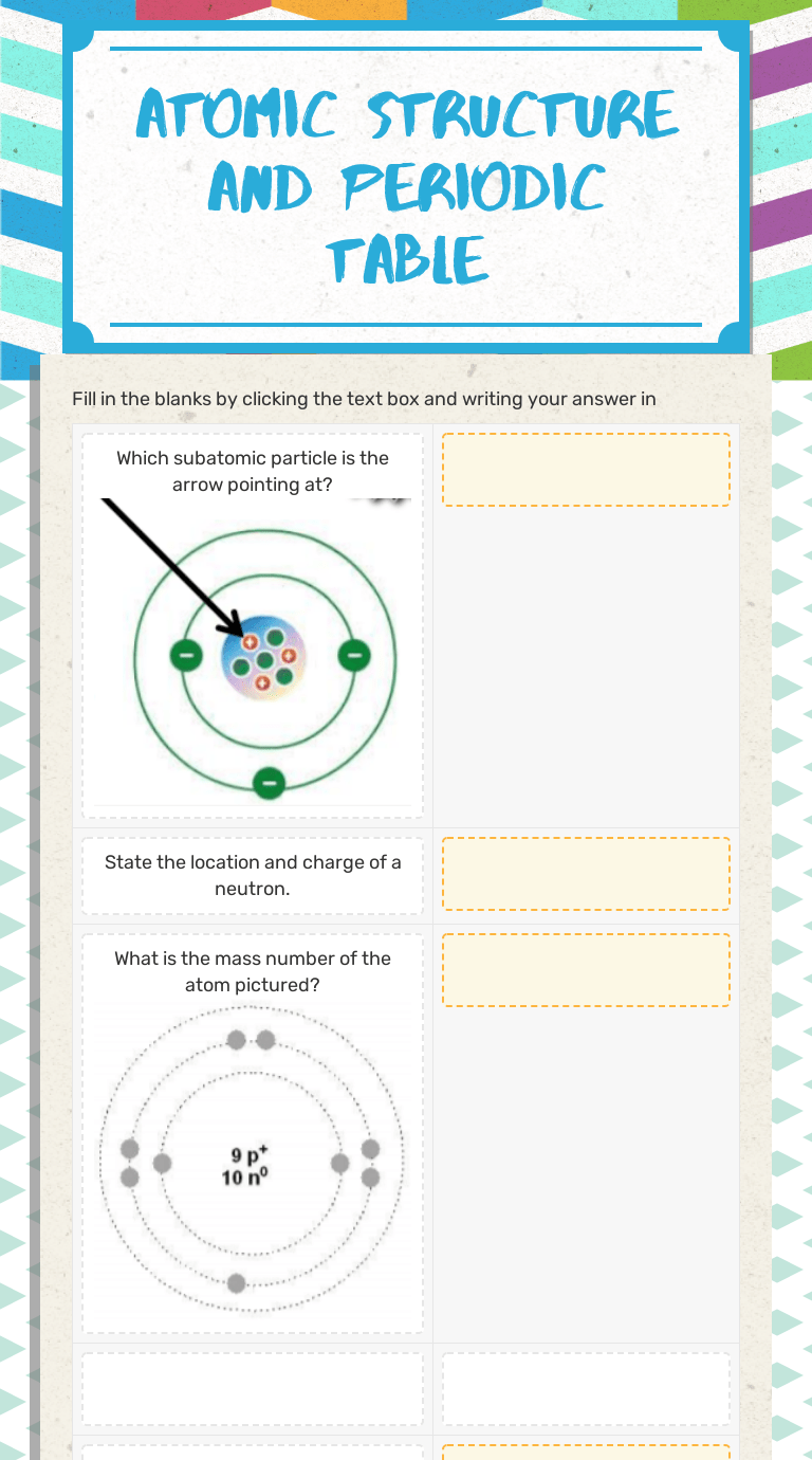 Worksheets For Aqa 9 1 4 1 Atomic Structure The Periodic Table 4 1 1 1 Atoms Elements Isotopes Teaching Resources from dryuc24b85zbr.cloudfront.net Why does the mass number only include the number of protons and the . List the 3 subatomic particles, their charges, masses and where in the atom they are located in the chart below:. The positively charged subatomic particle that remains when a hydrogen atom loses an electron is called a(n) proton. If you know the atomic number of an element, what other information can you figure out? (fill in the missing information). Structure of the 1st 20 elements in . The number of protons in one atom . How many neutrons are in the nucleus of an atom that has an atomic mass of .